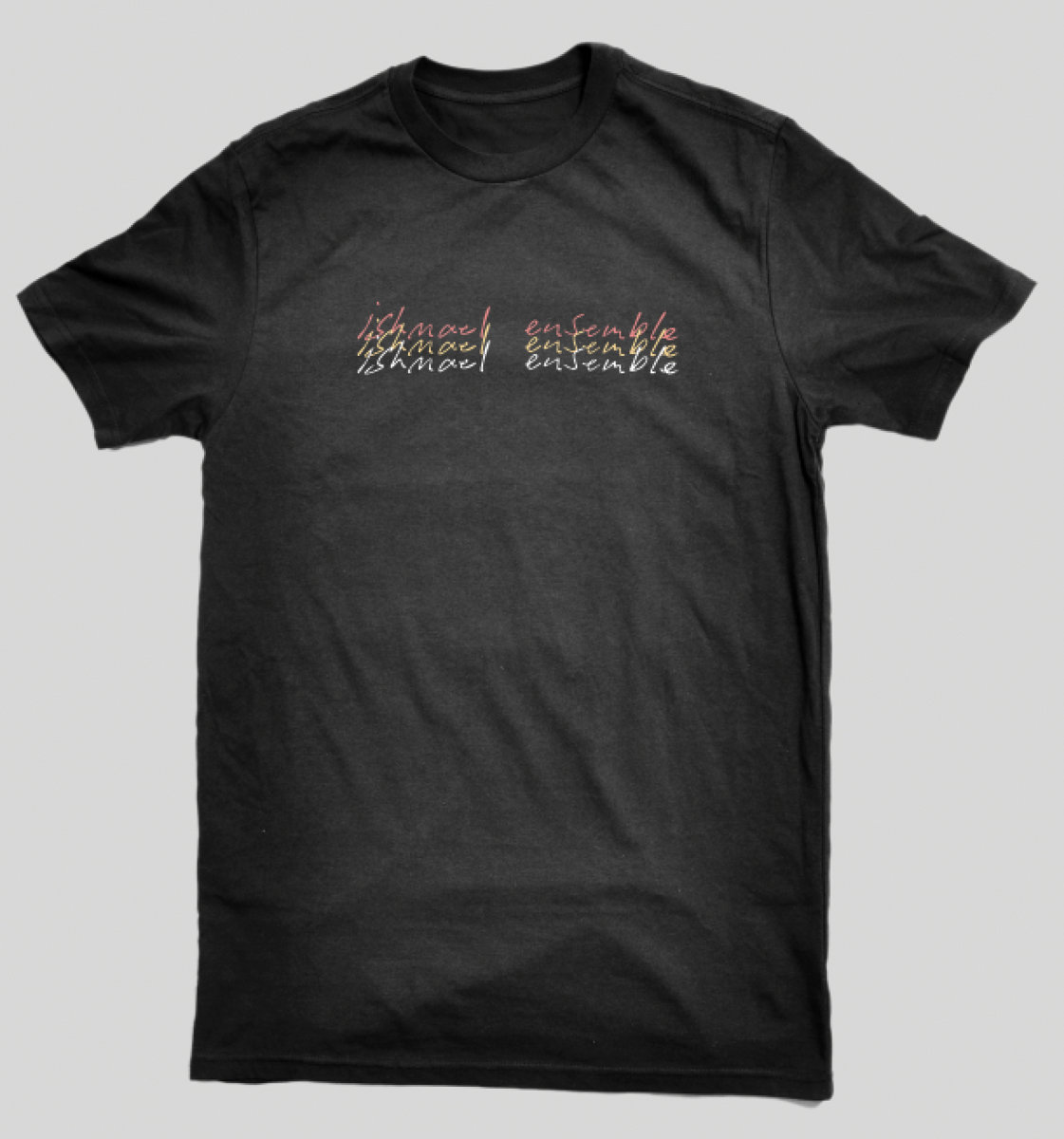 3 colour way handwritten "Ishmael Ensemble" logo. Screen printed on 100% cotton T-Shirt